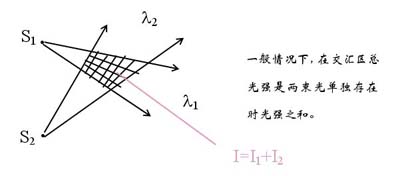 若l1=l2、相差不隨時間變化,且不是垂直相交此區(qū)內的光強分布將呈現為相干分布。