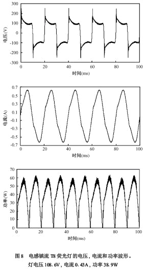 對于同樣色溫的熒光燈,充氣種類 (如氬或氪)對光波動幾乎沒有影響[7]。熒光燈的瞬時(shí)電壓、電流和功率如圖8、圖9所示。由于燈電壓接近方波,因此燈的功率波形基本由電流波形決定。電感鎮(zhèn)流器頻率為50Hz,電子鎮(zhèn)流器的頻率為48kHz。