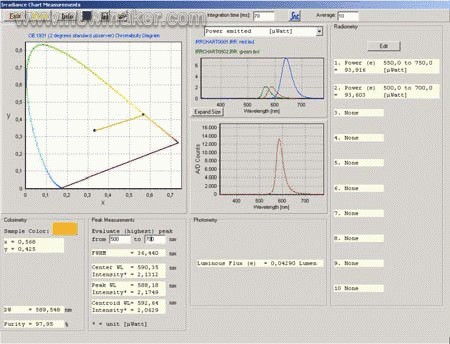LED 背光源是一個(gè)光輻射現(xiàn)象,對(duì)光亮度測(cè)量采用只需要在系統(tǒng)中搭配光亮度測(cè)試相關(guān)配件,如光斑光學(xué)組件(直徑是3,5,10mm),也可根據(jù)用戶要求定制光斑組件的大小,采用專用的光亮度軟件,可以實(shí)現(xiàn)對(duì)不同點(diǎn)光亮度值測(cè)試,可以在線計(jì)算多個(gè)點(diǎn)光亮度平均值和標(biāo)準(zhǔn)偏差值,并且在軟件里可以設(shè)置光亮度的閾值,在品質(zhì)檢測(cè)中,可以提示背光源光亮度值檢驗(yàn)的范圍標(biāo)準(zhǔn)。同時(shí)Avantes 公司的AvaSpec-2048 光亮度計(jì)通過AvaSoft-IRRAD 輻射測(cè)量軟件還可以對(duì)背光源光進(jìn)行光度學(xué)、色度學(xué)和輻射度學(xué)參數(shù)的分析,背光源較關(guān)注的參數(shù)的主波長(zhǎng)、色純度、光譜等,如: 光強(qiáng)度(單位為Candela)、輻射量(μWatt/cm2, μJoule/cm2,μWatt 或μJoule)、光度量(Lux 或 Lumen)、色坐標(biāo)X, Y, Z, x, y, z, u, v 和色溫等十多個(gè)參數(shù), 例如:主波長(zhǎng)、、中心波長(zhǎng)、峰值波長(zhǎng)等。