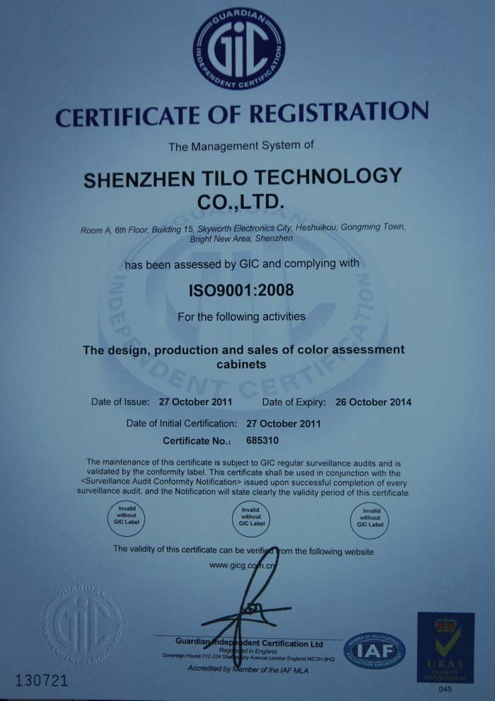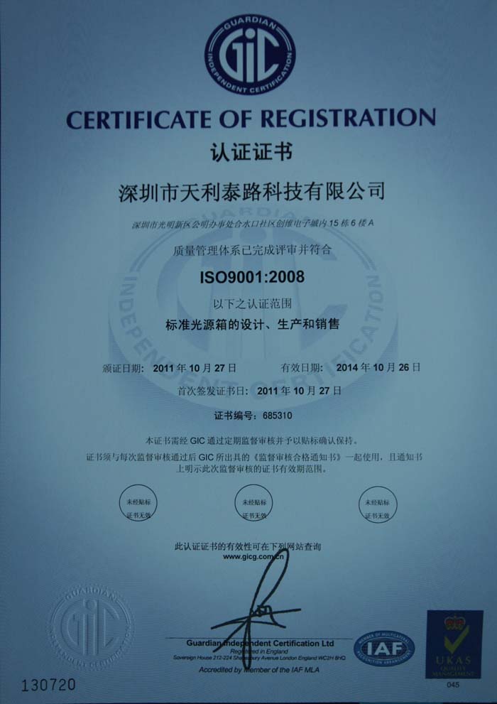 TILO 天友利(國內(nèi)首家標(biāo)準光源箱專業(yè)生產(chǎn)企業(yè),Since 1998)旗下:深圳市天利泰路科技有限公司是目前同行業(yè)有工商行政許可的工業(yè)區(qū)生產(chǎn)型公司(非貿(mào)易公司),也是通過ISO9001國際質(zhì)量管理體系認證的單位。