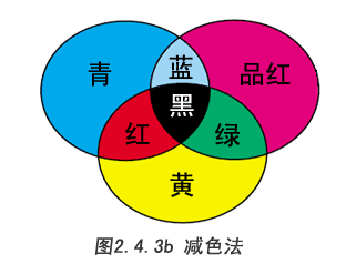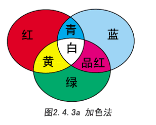 圖2.4.3a顯示了混合紅、綠、藍(lán)三種色彩后的視覺(jué)效果。 紅、綠、藍(lán)稱(chēng)為三原色,青、品紅、黃稱(chēng)為三間色(三補(bǔ)色)。