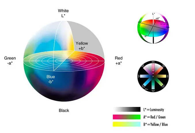 L*值域由0到100,L=50時,就相當于50%的黑;a*和b*的值域都是由+127至128,其中+127a就是洋紅色,漸漸過渡到-128a的時候就變成綠色;同樣原理,+127b是黃色,-128b是藍色。