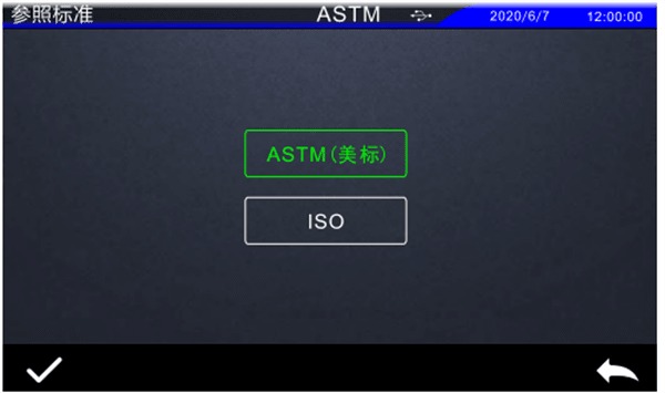 在主菜單中點擊“參照標準”,進入?yún)⒄諛藴试O(shè)置界面,可選擇ASTM(美標)或者ISO。選中“ASTM(美標)”,點擊確認“√”,儀器進入ASTM(美標)測量標準;選中“ISO”,點擊確認“、√”,儀器切換到ISO測量標準。如圖所示。