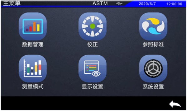 參照標準有ASTM(美標)和ISO兩種,本系列儀器在ASTM(美標)和ISO標準切換后,進行樣品測量時,儀器需要重新進行校正。在測量界面按“介”進入主菜單,在其他界面可以通過點擊下側(cè)的確認“√”、返回“〈”進入主菜單,如圖所示。