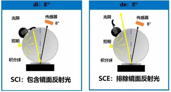 SCI和SCE一般只會出現(xiàn)在d/8結構的分光測色儀器的設置選項中,SCI指包含鏡面光方式,一般用于那些研究顏色本身屬性而不關心顏色所附著的樣品表面光澤度的廠家,如油漆涂料廠等。SCE指不包含鏡面光方式,一般適用于那些直接被人觀測到的,要求測量結果和目視非常接近的樣品,如家電外殼等。