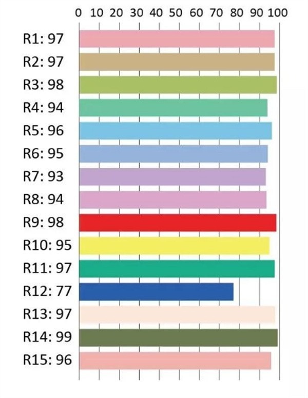 與陽光相比,陽光被認(rèn)為是理想的或CRI 100。這些原始的基準(zhǔn)色塊是R1到R8,如圖所示。