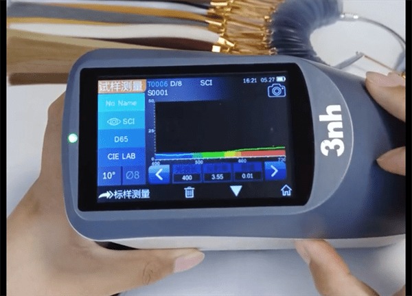 3. 標(biāo)樣測量。選取好一塊假發(fā)的某個位置,YS6010分光測色儀測量口緊貼假發(fā)表面,輕觸測量鍵進行測量。測量后測試屏幕會顯示相應(yīng)顏色數(shù)據(jù)。