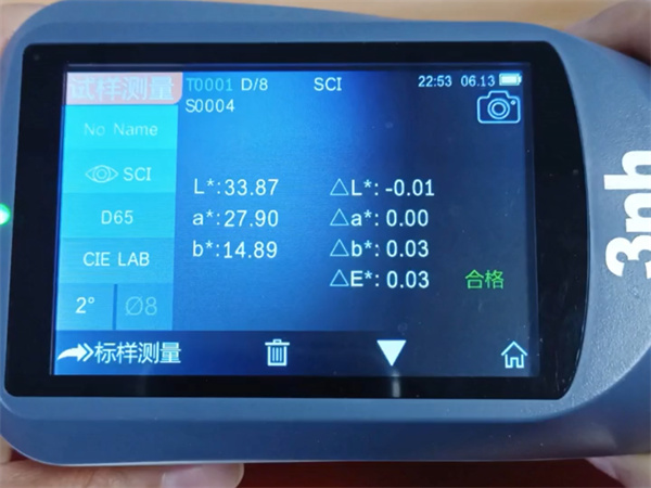 3. 開始測量。選取好測量點,將YS3060分光測色儀緊貼在塑膠板上,輕觸測量鍵進行測量。輕觸測量鍵,重新測量一次該點位。如圖所示,測量重復(fù)性為0.03.