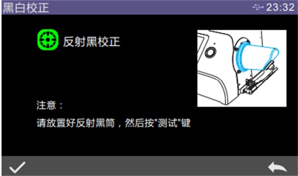 在主菜單界面點擊“黑白校正”進入黑白校正界面。在界面中會顯示目前校正是否有效以及校正有效剩余時間。點擊“→”,進入反射黑校界面,根據提示放好黑筒,然后按測量鍵進行黑筒校正?;蛘甙础啊比∠⑼顺鲂U?。