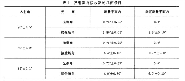 2. 光澤度儀的入射光束的中心線應(yīng)分別與受試表面的垂直線成20°±0.5°、60°±0.2或85°±0.1°角,接收器的中心線應(yīng)與入射光束中心線的鏡面影象重合。發(fā)射器與接收器的張角必須符合表1。