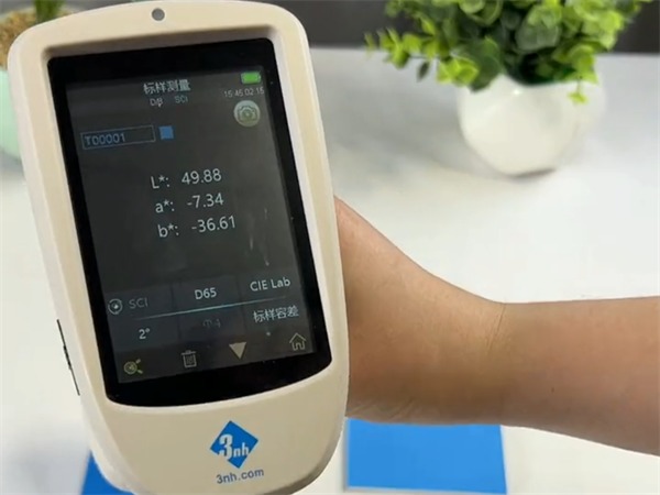 3. 標(biāo)樣測量。選取好測量點,將ST70便攜式分光測色儀緊貼在裝飾涂料上,輕觸測量鍵進(jìn)行測量。測量Lab值為:L 49.88、a -7.33 、b -36.61。
