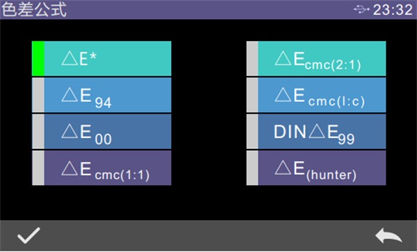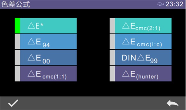 設(shè)置色差公式,用戶(hù)可以選擇△E、△Ecmc(2:1)、△E94、△Ecmc(l:c)等,選擇后,點(diǎn)擊“√”確認(rèn)采用該色差公式,如圖所示: