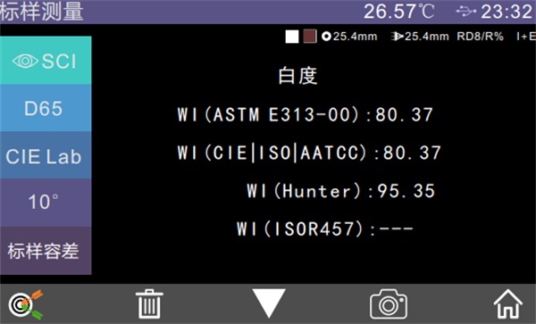 色度指標(biāo)設(shè)置后,被選中的顏色指數(shù)會(huì)在標(biāo)樣和試樣測(cè)量界面的顏色指數(shù)區(qū)顯示(根據(jù)指數(shù)的不同,部分指數(shù)只在試樣測(cè)量有顯示,且受透射和反射類(lèi)型影響)。在測(cè)量界面或查看記錄界面點(diǎn)擊“V”可以翻頁(yè)到顏色指數(shù)顯示區(qū),如圖為白度顯示界面。