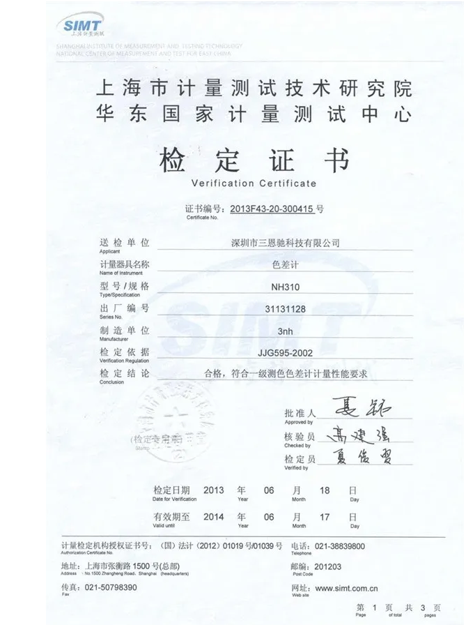 為了觀察得更為直觀,可以參看一級(jí)色差儀計(jì)量證書(shū),示例:nr110。