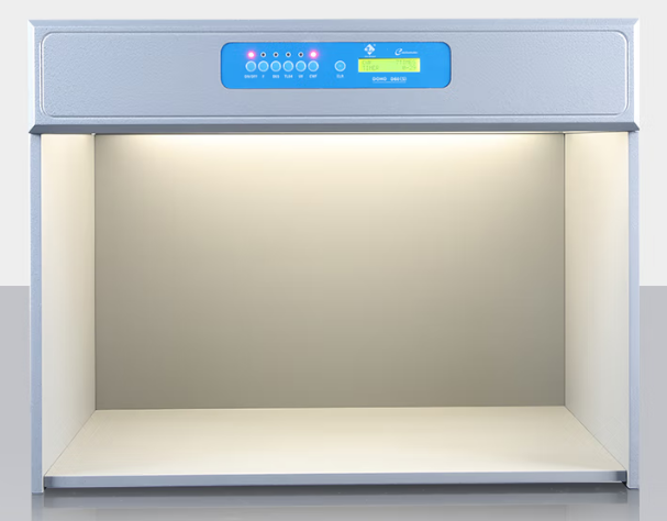 標準光源箱就是一種用來模擬各種觀察環(huán)境的照明燈箱設(shè)備,常見多光源標準光源箱中配有D65、TL84、CWF、U30、UV、A光源等等,可以用來模擬人工日光以及各種商業(yè)熒光等的照明條件,并且燈箱內(nèi)壁是無光澤的中性灰涂層,可以避免周圍場的雜色對顏色檢測結(jié)果的干擾。因此,標準光源箱可以提高目視測色的準確度,在印刷、紡織、油漆等行業(yè)顏色檢測領(lǐng)域有著廣泛的應(yīng)用。