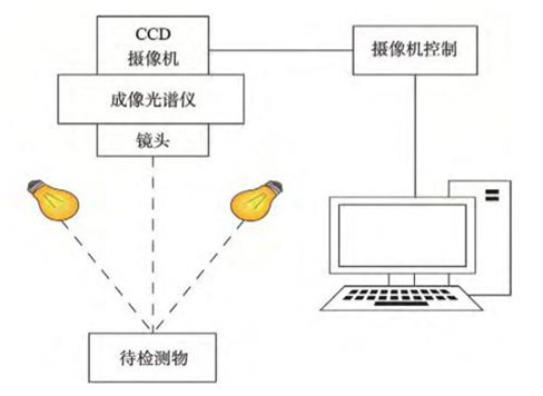 高光譜成像系統(tǒng)主要由光源、CCD攝像機(jī)、成像光譜儀、鏡頭、圖像采集卡、計(jì)算機(jī)及控制裝置等組成,見(jiàn)下圖1。其最主要的工作部件是成像光譜儀,它是一種新型傳感器,于20 世紀(jì)80年代初發(fā)展起來(lái)。該光譜儀最重要的特點(diǎn)在于波段多且寬度窄,使得高光譜成像儀能探測(cè)到別的寬波段無(wú)法探測(cè)到的物體,光譜響應(yīng)范圍更廣,光譜分辨率更高,能夠更加精細(xì)地發(fā)現(xiàn)被探測(cè)物的微小特征,更重要的是它可以提供空間域和光譜域信息的結(jié)合,也就是“圖譜合一”,但同時(shí)也存在著數(shù)據(jù)量大、冗余信息多的特點(diǎn)。