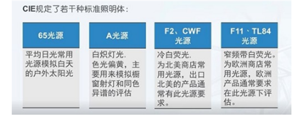 CIE規(guī)定了若干種標(biāo)準(zhǔn)照明體,來(lái)模擬不同應(yīng)用場(chǎng)景下的光源,相同一個(gè)樣品在不同的照明體下計(jì)算得出的顏色數(shù)據(jù)是不同的。選擇一種與目視評(píng)估使用光源類(lèi)型一致的標(biāo)準(zhǔn)照明體,才會(huì)得到相一致的結(jié)果。比如目視是在在戶外或者燈箱D65照明下,儀器中就要選擇對(duì)應(yīng)的D65標(biāo)準(zhǔn)照明體。