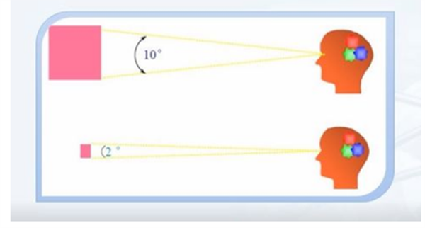 視角又叫標(biāo)準(zhǔn)觀察者,是指CIE制定標(biāo)準(zhǔn)時(shí)樣品在觀察者眼睛中投影的夾角,有兩個(gè)標(biāo)準(zhǔn),一個(gè)是2°,另外一個(gè)是10°。2°對(duì)應(yīng)于小樣品或遠(yuǎn)觀樣品,10°對(duì)應(yīng)于大樣品或近看樣品。如果評(píng)估產(chǎn)品面積很大,而儀器中選擇了2°視角,就容易出現(xiàn)不匹配的情況。
