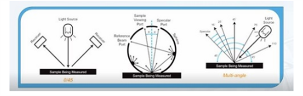 色差儀常用的有三種幾何結(jié)構(gòu),包括0°/45°,d/8°和多角度,其中d/8°還有包含鏡面反射狀態(tài)和排除鏡面反射狀態(tài)。同一個(gè)樣品使用不同的幾何結(jié)構(gòu)的分光光度儀測(cè)量得到的結(jié)果是不同的。為了達(dá)到與目測(cè)結(jié)果一致,建議按照如下原則選擇儀器和設(shè)置:
