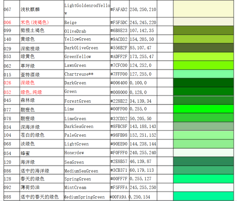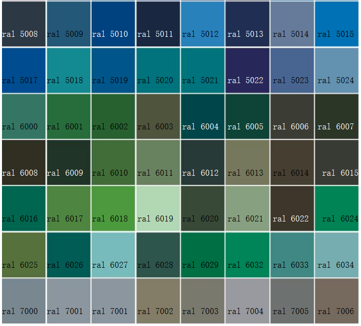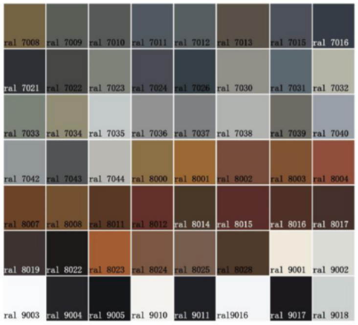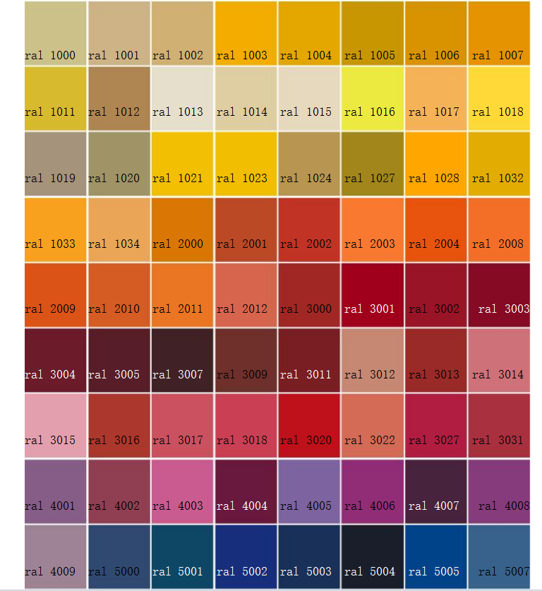 RAL系列提供了多種顏色的命名和對應的RAL編號,如RAL 1000米綠色(RAL 1000),RAL 1004金黃色(RAL 1004)等。
