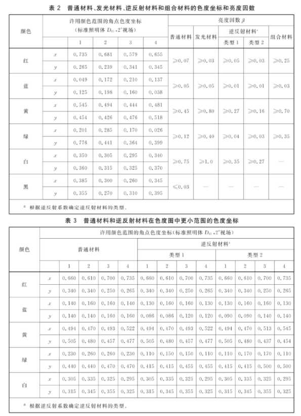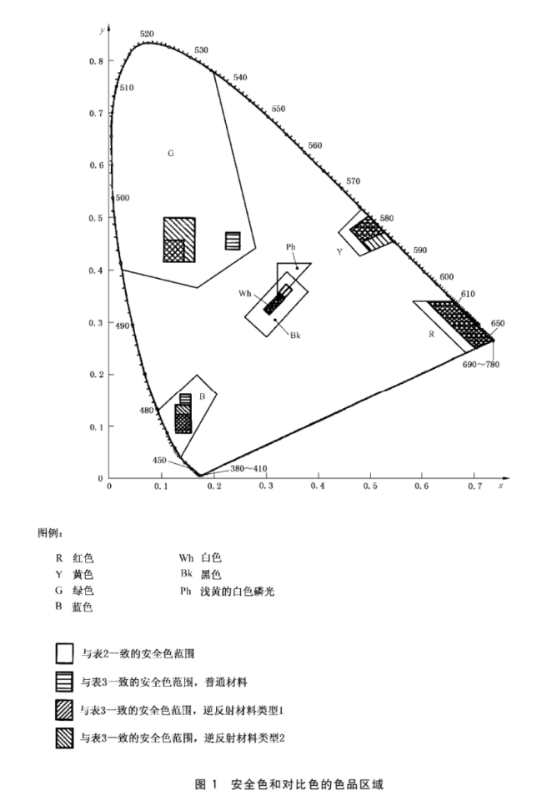 滿足精確顏色要求的安全色色度范圍應(yīng)符合表3的要求,磷光色的對比色和亮度因數(shù)應(yīng)如圖1和表4所示。