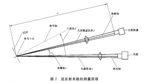 試樣參考中心對光源孔徑張角及對光探測器孔徑張角應(yīng)分別不大于12’。試樣整個(gè)受照區(qū)域內(nèi)的垂直照度不均勻性小于5%,試樣參考軸相對于光源軸的人射角(3)應(yīng)能在0*~40*范圍內(nèi)變化。觀測軸相對于照明軸之間的觀測角(a)應(yīng)能在0.2*~2"范圍內(nèi)改變。