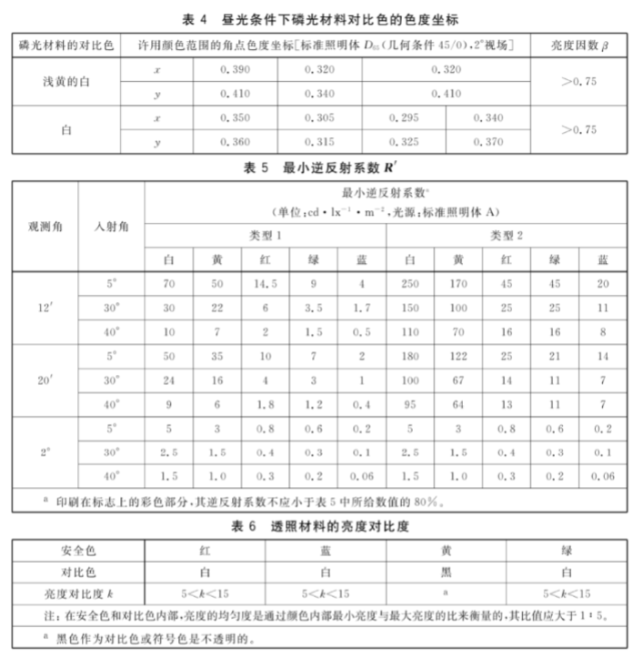 含有逆反射材料的最小逆反射系數(shù)如表5所示,