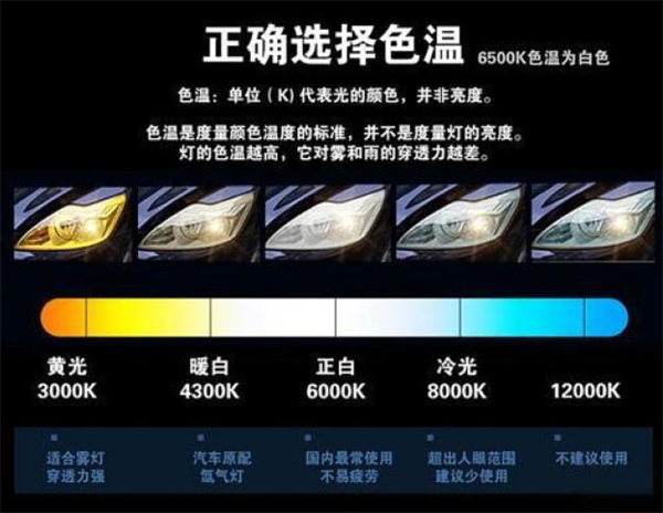 色溫與車燈穿透力有一定的關(guān)系,車燈的穿透性越強(qiáng)也就是說(shuō),在雨天和霧天的環(huán)境中,它可以使駕駛員看得更遠(yuǎn),更清晰,避免由于視線不佳而造成危險(xiǎn),并且還可以讓對(duì)面的行人或道路上的汽車提早發(fā)現(xiàn),以防止發(fā)生事故。什么樣的壓顏色光穿透力強(qiáng)?這取決于其色溫。