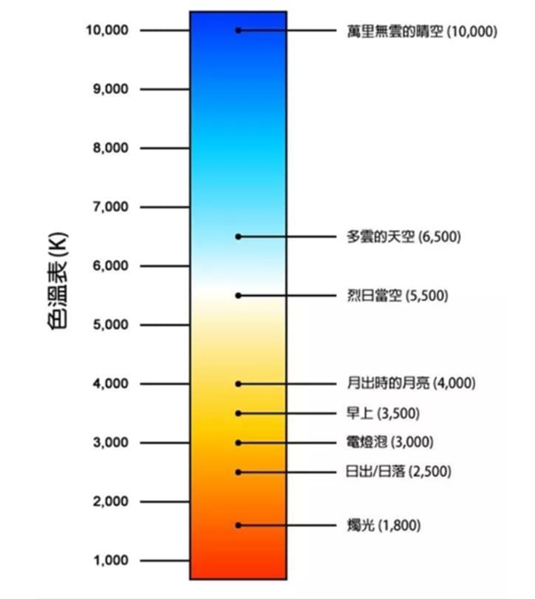 色溫是表示光線中包含顏色成分的一個(gè)計(jì)量單位。色溫是以絕對(duì)溫度K來(lái)表示,即將一標(biāo)準(zhǔn)黑體加熱,溫度升高到一定程度時(shí)顏色開始由深紅-淺紅-橙黃-白-藍(lán),逐漸改變,某光源與黑體的顏色相同時(shí),黑體當(dāng)時(shí)的絕對(duì)溫度顏色,就是光源的色溫顏色。上圖就是標(biāo)準(zhǔn)色溫對(duì)照表。