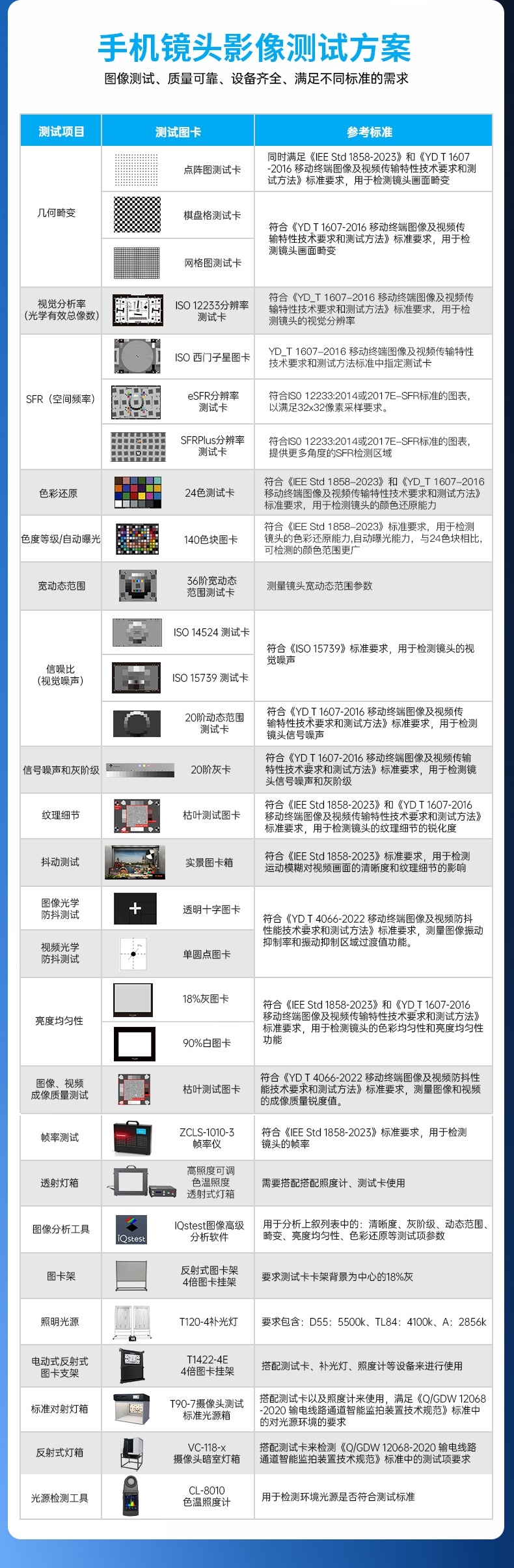 分辨率測(cè)試是評(píng)估攝像頭成像質(zhì)量的基礎(chǔ)項(xiàng)目,采用ISO 12233標(biāo)準(zhǔn)測(cè)試卡進(jìn)行。測(cè)試時(shí)將攝像頭設(shè)置為最高分辨率模式,拍攝包含2000線或4000線楔形圖的測(cè)試卡,通過(guò)專業(yè)軟件分析圖像中心與邊緣的分辨率。行業(yè)標(biāo)準(zhǔn)要求VGA(0.3M)攝像頭中心分辨率≥350LW/PH,四角≥250LW/PH;5M攝像頭中心≥1200LW/PH,四角≥1000LW/PH。IEEE 1858-2023標(biāo)準(zhǔn)進(jìn)一步規(guī)定了手機(jī)攝像頭圖像質(zhì)量的量化評(píng)估方法,包括空間頻率響應(yīng)(SFR)和調(diào)制傳遞函數(shù)(MTF)的測(cè)量要求。