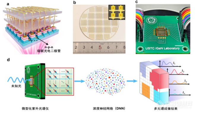 中國科學技術大學教授孫海定聯(lián)合中國科學院院士、武漢大學教授劉勝團隊,成功研制出微型紫外光譜儀,實現(xiàn)片上光譜成像。該光譜成像儀基于新型氮化鎵基級聯(lián)光電二極管架構,并與深度神經網(wǎng)絡算法融合,實現(xiàn)了高精度光譜探測與高分辨率多光譜成像,其光譜響應速度達到超快納秒級。日前,相關成果在線發(fā)表于《自然-光子學》。