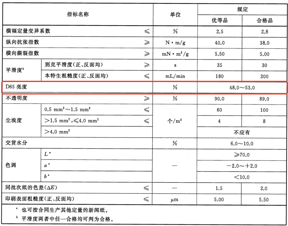 這一標準明確規(guī)定了新聞紙的D65亮度(即白度)范圍。D65亮度是指在D65光源模擬日光條件下,紙張對457nm藍光的漫反射因數(shù)測量值。在日常生活中,我們簡單稱之為“白度”。