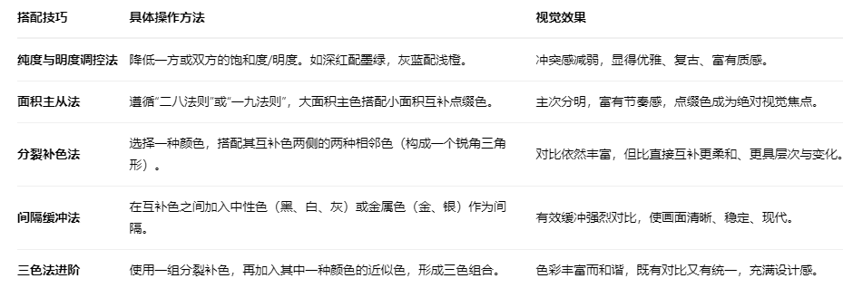 直接使用高純度的互補(bǔ)色,雖能瞬間吸引眼球,但也極易造成視覺(jué)疲勞和廉價(jià)感。高級(jí)的搭配在于控制與調(diào)和。