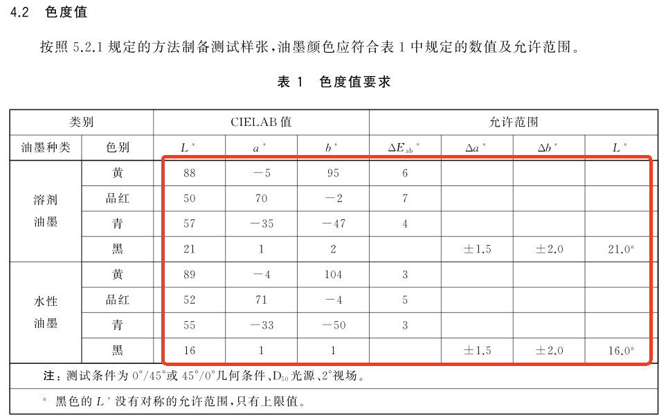 標(biāo)準(zhǔn)對四色油墨的色度坐標(biāo)(CIE 1931 XYZ或CIE 1976 Lab*)規(guī)定了目標(biāo)值和容差范圍。以D50光源、2°視場、0°/45°觀察幾何條件為基準(zhǔn),標(biāo)準(zhǔn)給出了青、品紅、黃、黑四色油墨的參考色度值及允許偏差。