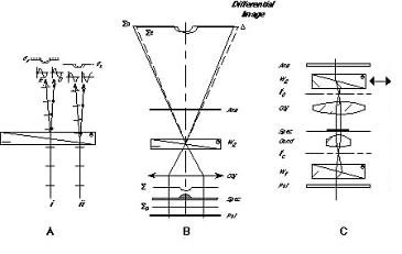 DIC的物理原理完全不同于相差顯微鏡,技術(shù)設(shè)計(jì)要復(fù)雜得多。DIC利用的是偏振光,有四個(gè)特殊的光學(xué)組件:偏振器(polarizer)、DIC棱鏡、DIC滑行器和檢偏器(analyzer)。偏振器直接裝在聚光系統(tǒng)的前面,使光線發(fā)生線性偏振。在聚光器中則安裝了偌瑪斯斯棱鏡,即DIC棱鏡,此棱鏡可將一束光分解成偏振方向不同的兩束光(x和y),二者成一小夾角。聚光器將兩束光調(diào)整成與顯微鏡光軸平行的方向。初始兩束光相位一致,在穿過標(biāo)本相鄰的區(qū)域后,由于標(biāo)本的厚度和折射率不同,引起了兩束光發(fā)生了光程差。在物鏡的后焦面處安裝了第二個(gè)偌瑪斯斯棱鏡,即DIC滑行器,它把兩束光波合并成一束。