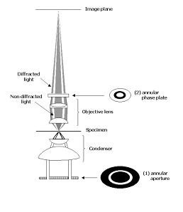 相差的基本原理是,把透過標(biāo)本的可見光的光程差變成振幅差,從而提高了各種結(jié)構(gòu)間的對(duì)比度,使各種結(jié)構(gòu)變得清晰可見。光線透過標(biāo)本后發(fā)生折射,偏離了原來的光路,同時(shí)被延遲了1/4λ(波長),如果再增加或減少1/4λ,則光程差變?yōu)?/2λ,兩束光合軸后干涉加強(qiáng),振幅增大或減下,提高反差。在構(gòu)造上,相差顯微鏡有不同于普通光學(xué)顯微鏡兩個(gè)特殊之處: