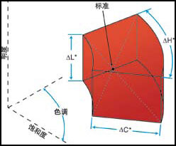 顏色容差主要是針對樣品和已知標(biāo)準(zhǔn)顏色測量值的比較,這樣可判斷樣品與標(biāo)準(zhǔn)的接近程度。CIE LAB容差公式以標(biāo)準(zhǔn)為中心,然后給予個別L*a*b*數(shù)值,正負(fù)(+/-)的誤差范圍 △L*= L*樣品- L*標(biāo)準(zhǔn)(明度差異) △a*= a*樣品- a*標(biāo)準(zhǔn)(紅/綠差異) △b*= b*樣品- b*標(biāo)準(zhǔn)(黃/藍(lán)差異) 此容差公式,可以簡單直接顯示顏色誤差原因