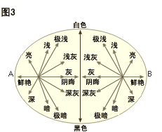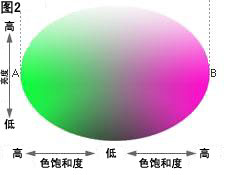 當(dāng)比較各種顏色的亮度(顏色的明亮程度如何)時,顏色就有明亮和深暗之分。 例如,將檸檬的黃色和葡萄柚的黃色來說, 毫無疑問,檸檬的黃色就比較明亮。 把檸檬的黃色和歐洲甜櫻桃的紅色相比, 顯然,也是檸檬黃比較明亮。 可見,顏色亮度的測量與色調(diào)無關(guān)。 現(xiàn)在,讓我們來看一看圖2。圖2是圖1沿A(綠)B(紫紅)直線切開的剖面圖。 可以看出,亮度沿垂直方向變化,越往上去,色彩越明亮,越往下去,則越深暗。