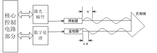 由圖所顯示的關(guān)系,我們可以知道,用正弦信號調(diào)制發(fā)射信號的幅度,通過檢測從目標(biāo)反射的回波信號與發(fā)射信號之間的相移φ,通過計(jì)算即可以得到待測距離。Δ