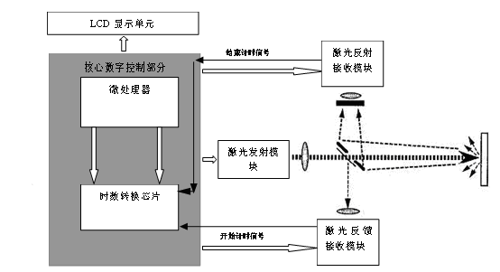 相位法與超聲波測速測距所用方法相類似,大測量距離通常為幾百米,能較容易達(dá)到毫米的數(shù)量級,但是按照該方法設(shè)計(jì)的測距儀的大測量距離是受到限制的,不可擴(kuò)展。該方法主要在國外應(yīng)用較廣。而脈沖法激光測距一般采用紅外激光,包括近紅外激光和中紅外激光。該波段激光有可見和非可見之分。且基于此技術(shù)的測距儀對相干性要求低、速度快、實(shí)現(xiàn)結(jié)構(gòu)簡單、峰值輸出功率高、重復(fù)頻率高且范圍大,所以此項(xiàng)目使用的是脈沖方法設(shè)計(jì)手持激光測距儀。脈沖法激光測距的原理是: