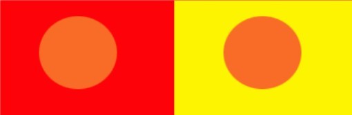 將相同的橙色,放在紅色或黃色上,我們將會發(fā)現(xiàn),在紅色上的橙色會偏黃的感覺,因為橙色是由紅色和黃色調(diào)成的,當(dāng)他和紅色并列時,相同的成分被調(diào)和而相異部分被真強,所以看起來比單獨時偏黃,以其他色彩比較會有這種現(xiàn)象,我們成為色名對比。