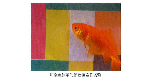 令人吃驚的是,顏以恒常性特性其實是神經(jīng)系統(tǒng)的一種非常基本的特征。它不包含記憶的作用,更沒有高級的思維因素,似乎是深植于我們視覺系統(tǒng)底層結構中的某種東西。事實上,顏色恒常性已經(jīng)在像金魚這類具有簡單神經(jīng)系統(tǒng)的動物身上得到了證實(見圖1-25)。對于人類,顏色恒常性看來是視網(wǎng)膜中央-四周區(qū)域視場上發(fā)生的類似相反色作用的結果,然而這個相反色作用卻不是發(fā)生在視網(wǎng)膜的第二層,中央-四周區(qū)域視場對顏色恒常性的響應似乎發(fā)生在大腦的視覺皮層,而且它們遠比相反色的起因復雜。