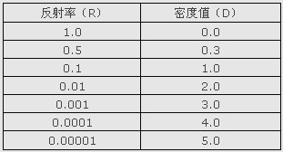 為了更好地理解密度的含義,我們設(shè)想有一個能夠100%反射入射光的表面,我們稱這樣的表面為完全漫反射體。這個表面的反射率R=1.0,因此密度值就是0。如果我們進(jìn)一步考察其他的一些表面,它們分別可以反射入射光的50%,1%,0.1% …… 因此,我們就可以得到下面的一系列數(shù)值: