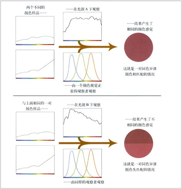 ?同色異譜是當(dāng)兩個顏色樣品在特定光源下產(chǎn)生不同顏色感覺的現(xiàn)象。
