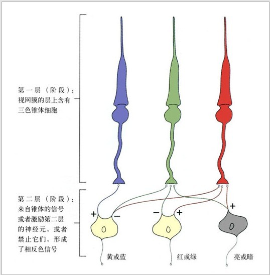 (圖1-14:神網(wǎng)膜中的三色學(xué)說與相反色學(xué)說)