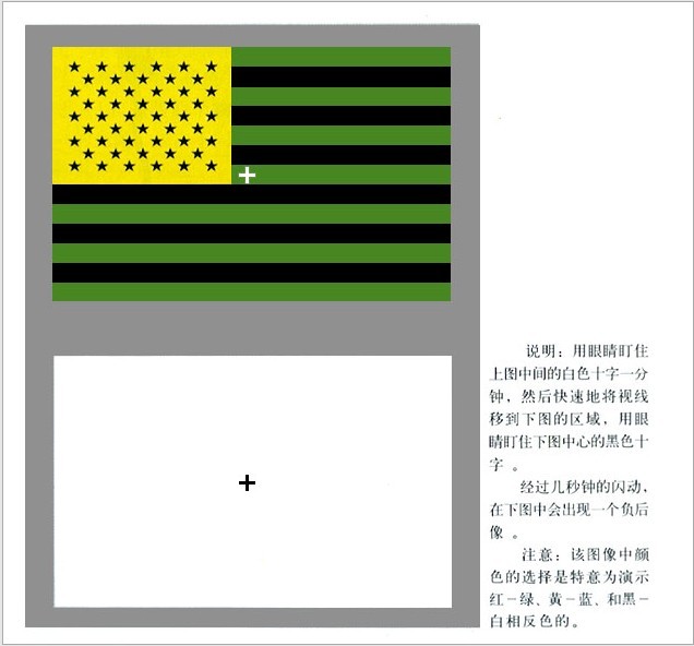 其他三色學(xué)說無法解釋的顏色視覺現(xiàn)象。我們無法想像一種帶紅的綠或帶綠的紅。這一事實說明有些現(xiàn)象已經(jīng)超出了三種獨(dú)立感受器(三色學(xué)說)所能解釋的范疇。對于藍(lán)和黃也同樣存在這種問題,因為我們也無法想像帶有黃色的藍(lán)。圖1-12和圖1-13所示的的同時對比與負(fù)后像現(xiàn)象是另外兩個顏色視覺現(xiàn)象的例子,它們說明,若缺少了某個顏色,則會產(chǎn)生出與該顏色互補(bǔ)的顏色感覺。后,顏色視覺異常的人(色盲)缺失的顏色感覺通常是成對的:一個人的紅色響應(yīng)異常,則通常他也缺少綠色辨別能力;一個人若沒有藍(lán)色響應(yīng),則也一定沒有黃色響應(yīng)。