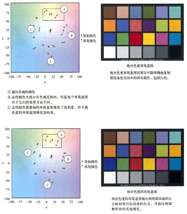 我們使用四種再現意圖的每一種將如圖所示的MacBeth Color Checker色標再現為CMYK數值。每個再現意圖的結果都表示在LAB色空間的a,b平面上。用綠色點表示原始的顏色,而用紅色點表示相應的再現顏色。