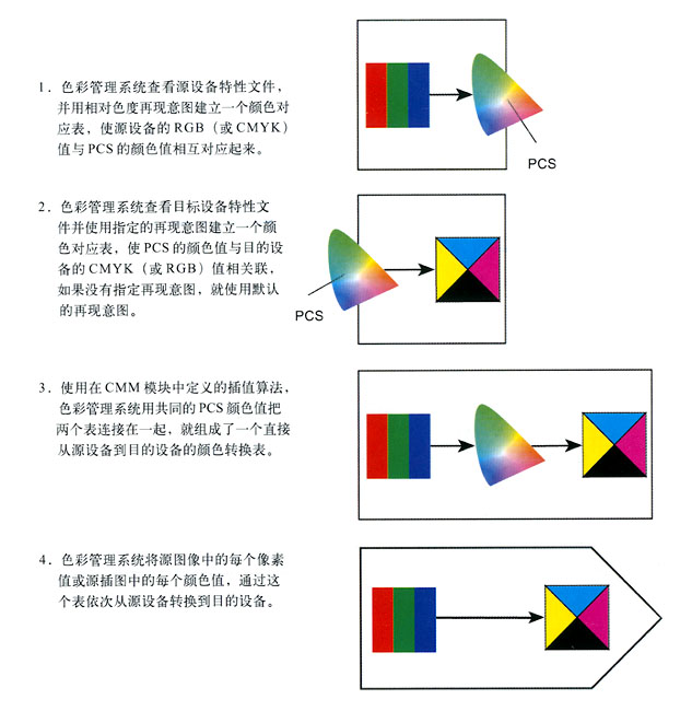 綜上所述,色彩管理系統進行顏色轉換的各個步驟如圖3-7所示。