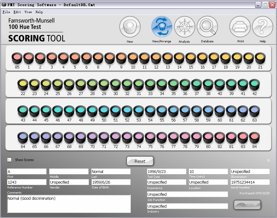 3. 評分系統(tǒng)(Farnsworth Munsell 100 Hue Scoring System)為一個光盤,內(nèi)有計分軟件;可安裝在電腦中,用于后計分、保存測試記錄和出具測試報告;