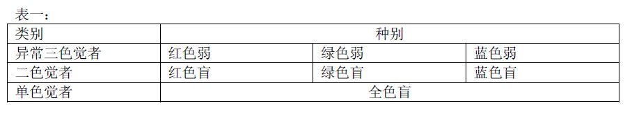 先天性色覺障礙的原因在于視色素的光化學(xué)不正常。根據(jù)對顏色的匹配情況色覺異常可分為:異常三色覺者、二色覺者、單色覺者(全色盲)表一: